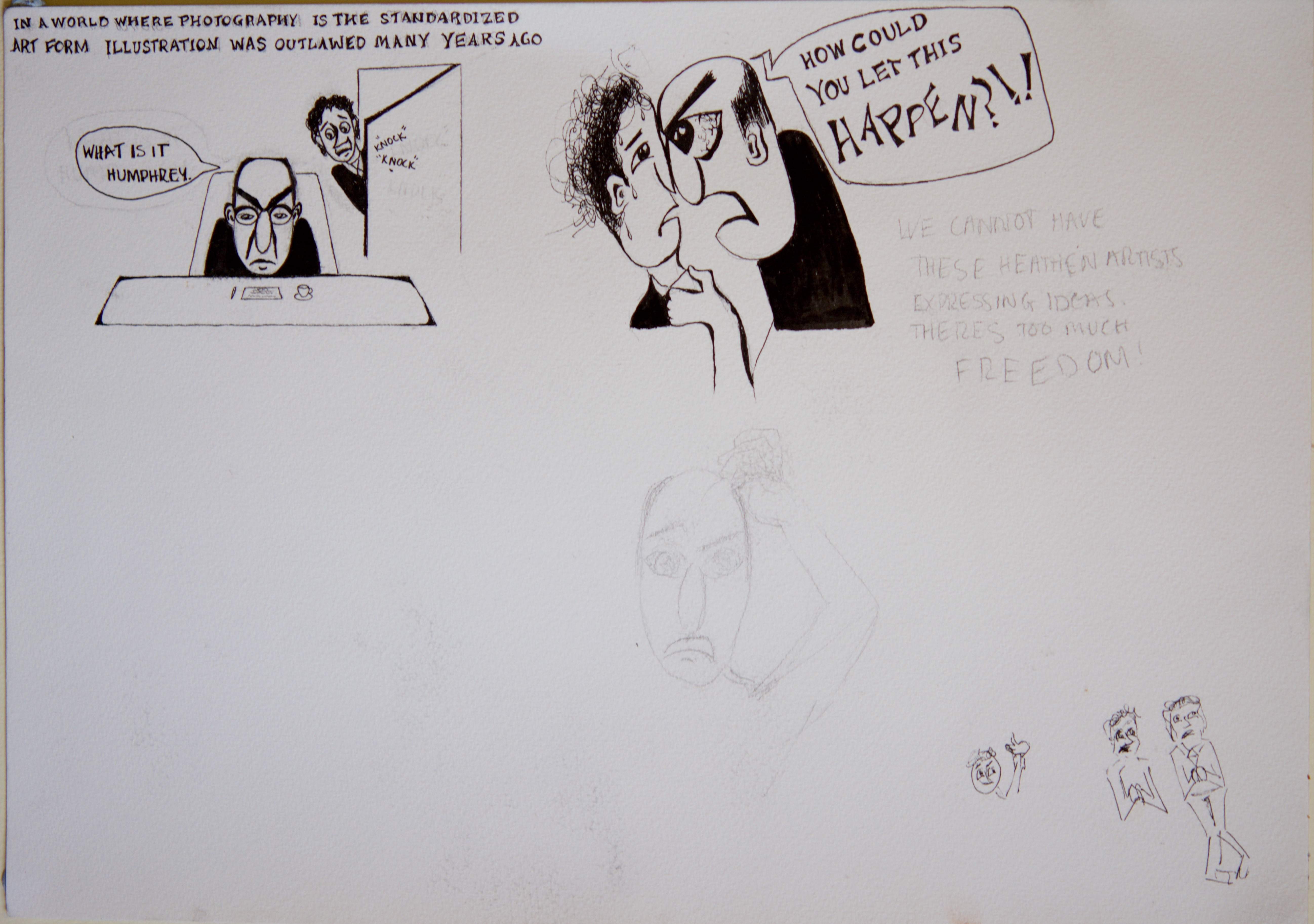 I then moved on from this idea to explore different styles of illustration, and then I considered creating a narrative of a world in which illustration does not exist. Proceeding to create this sequence within the context of a political cartoon, I began studying the newspaper and satirical cartoons and the style in which they were produced.