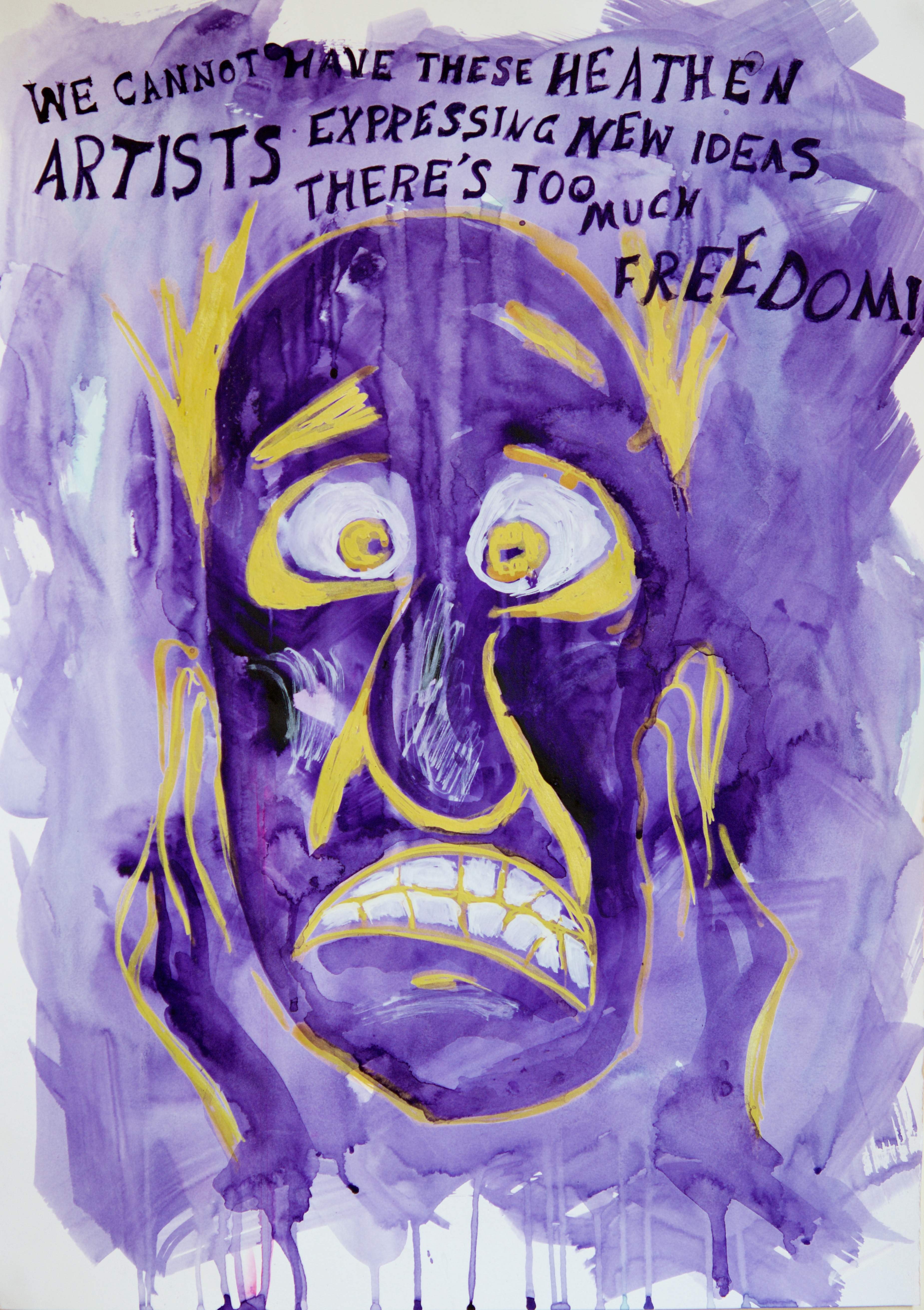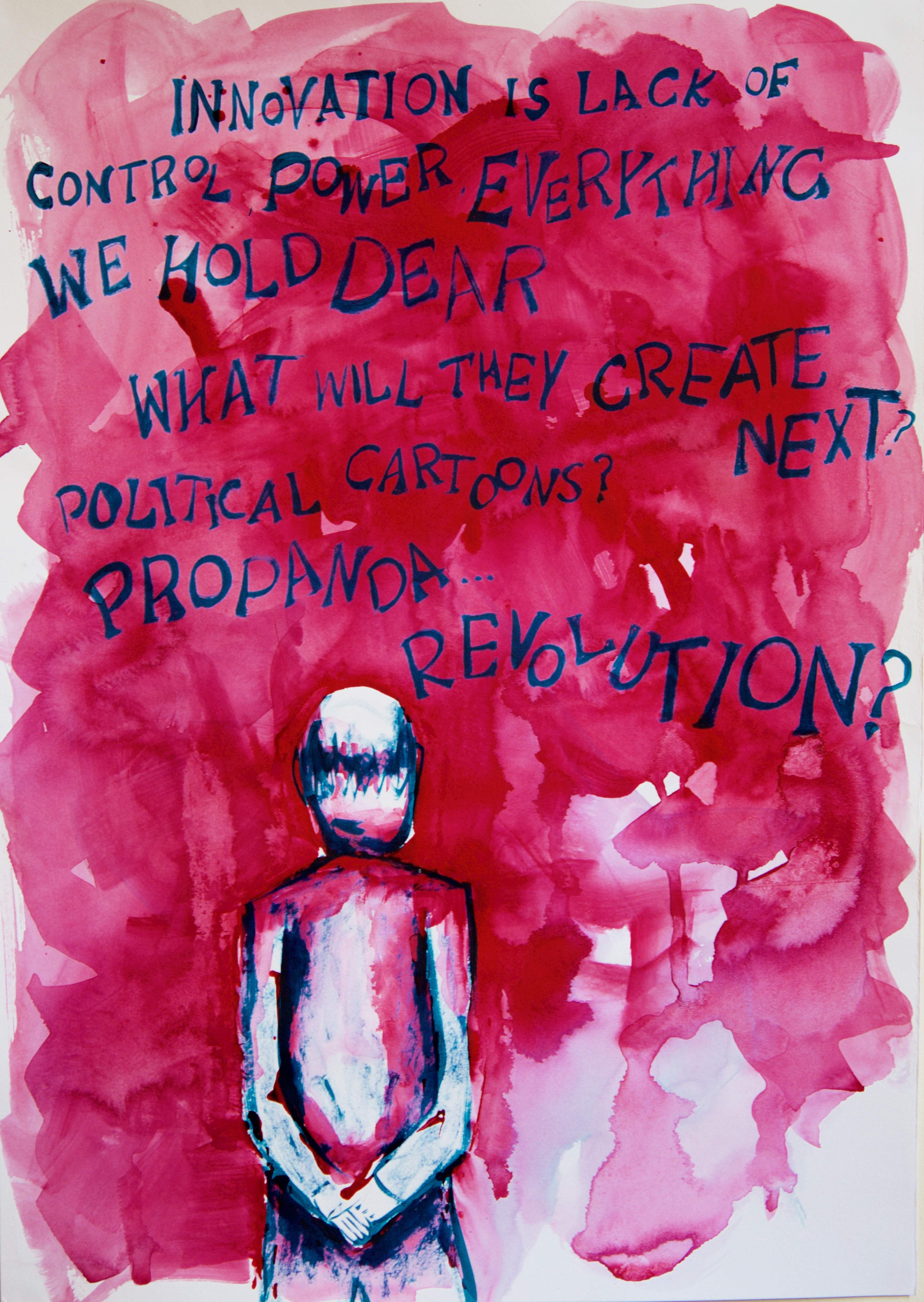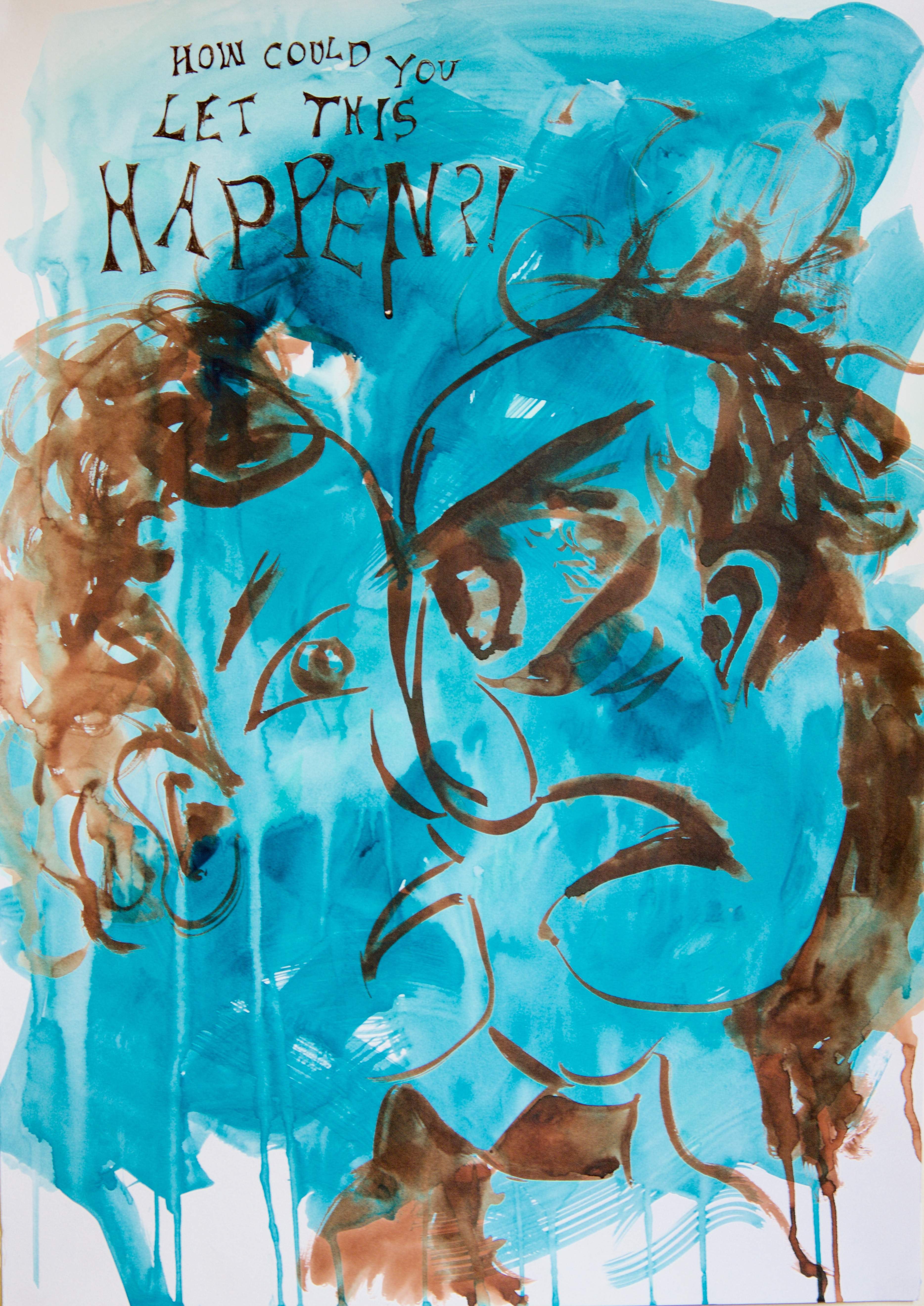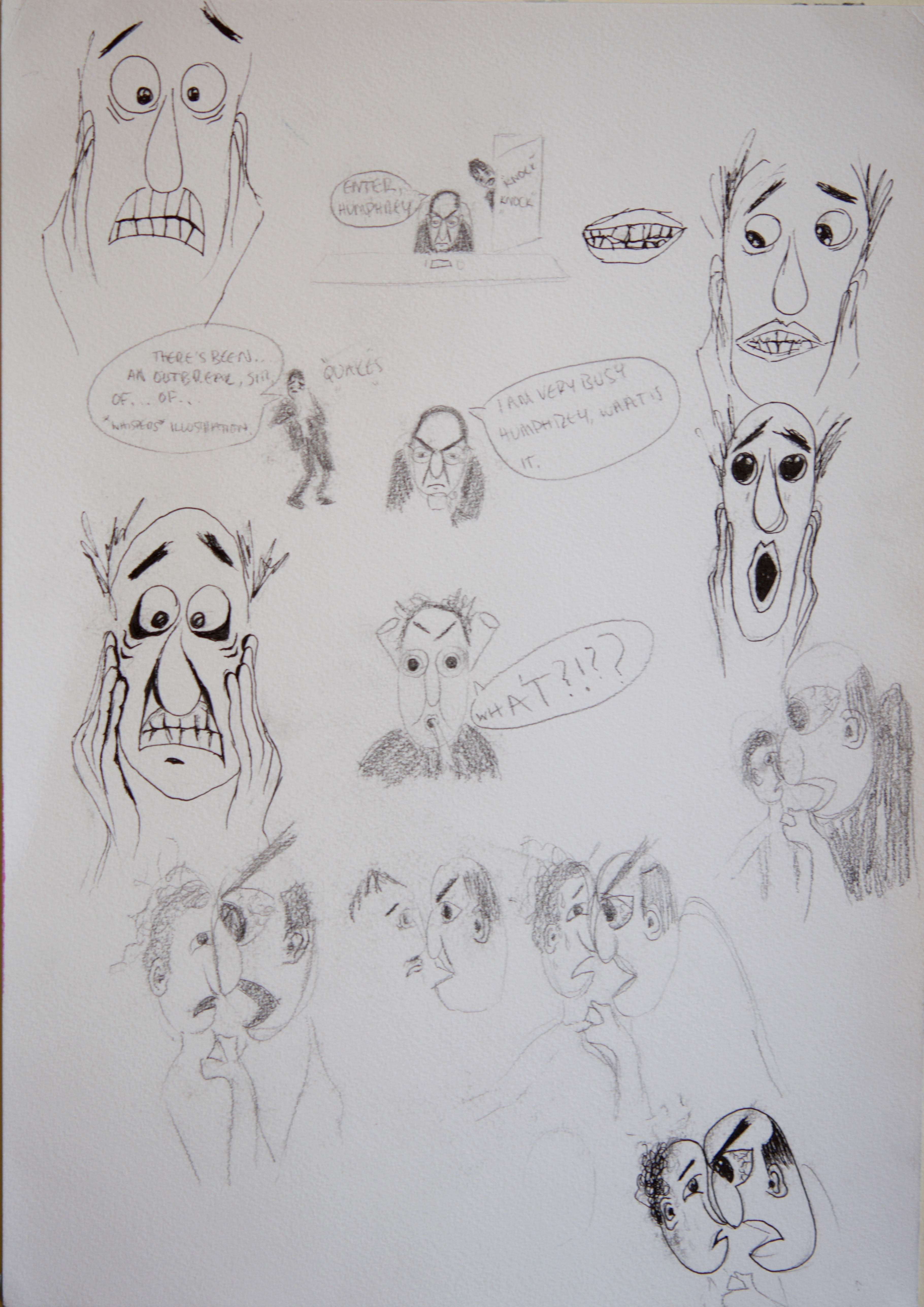 The final pieces were a series of experiments, pushing the boundaries of what my illustrative style could become. I was quite pleased with the outcomes as I felt the emotions depicted in the cartoon really brought the pictures to life. It was noted that I could have bound the final images into a book as they seemed 'unfinished' however, I really liked the tactility of the large final images, and I felt that presenting them in any other way would diminish the power of the imagery.